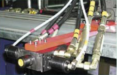聚氨酯組分原料經(jīng)過連續(xù)高壓發(fā)泡機的計量泵精密計量后,按照一定配比,被送入混合頭均勻地布料在復(fù)合板的底層面材上,并和上層面材同時被送入雙履帶層壓輸送機,聚氨酯泡沫在雙履帶層壓輸送機的上下輸送鏈板間發(fā)泡,并固定成型。待固定成型后,復(fù)合板在生產(chǎn)線上被自動跟蹤,切斷機按需切成一定長度的成品。